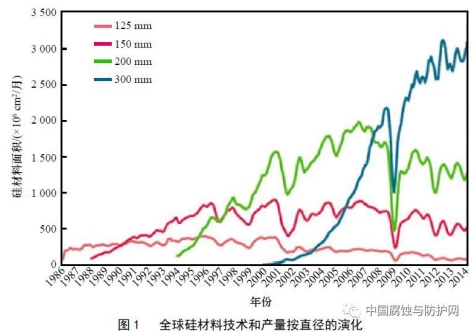 高新技术的快速发展对关键基础材料提出新的挑战和需求,同时材料更新换代又促进了高技术成果向生产力的转化。例如,微电子芯片集成度及信息处理速度大幅提高,成本不断降低,硅材料发挥了重要作用。目前,300 mm 硅片可满足14 nm技术节点的集成电路要求,450 mm 硅片已产出样片。全球硅材料技术和产量按直径的演化见图1。低温共烧陶瓷技术(LTCC)的研发取得重要突破,大量无源电子元件整合于同一基板内已成为可能。伴随着先进材料研究技术的不断延展,也产生了诸多新兴产业。如氮化镓等化合物半导体材料的发展,催生了半导体照明技术;白光LED 的光效已远远超过白炽灯和荧光灯,给照明工业带来革命性的变化。太阳能电池转换效率不断提高,极大地推动了新能源产业发展。镁合金与钛合金等高性能结构材料的加工技术取得突破,成本不断降低,研究与应用重点由航空、航天扩展到高附加值民用领域。基于分子和基因等临床诊断材料和器械的发展,使肝癌等重大疾病得以早日发现和治疗;介入器械的研发催生了微创和介入治疗技术,使心脏病及其他疾病的死亡率大幅下降。