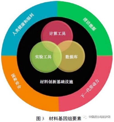 进入21 世纪以来,发达国家逐渐意识到依赖于试错的传统材料研究方法已跟不上工业快速发展的步伐,甚至可能成为制约技术进步的瓶颈。因此,亟需革新材料研发方法,加速材料从研发到应用的进程。例如,作为美国政府“先进制造伙伴计划”(AMP)的重要组成部分,2011年启动的“材料基因组计划”(MGI),其新材料从发现到应用的速度至少提高一倍,成本至少降低一半,旨在发展以先进材料为基础的高端制造业,并继续保持其在核心科技领域的优势,材料基因组要素见图3。MGI的具体内容包括:①发展高通量计算工具和方法,减少耗时费力的实验,加快材料设计;②发展和推广高通量材料制备和检测工具,更快地进行候选材料验证和筛选;③发展和完善材料数据库/ 信息学工具,有效管理材料从发现到应用全过程数据链;④培育开放、协作的新型合作模式。
