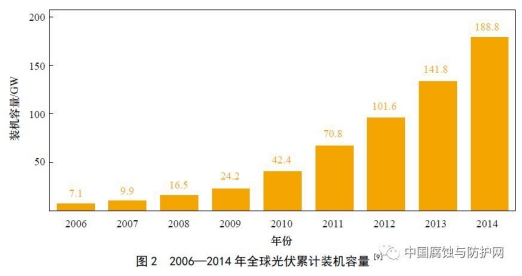 以新能源为代表的新兴产业崛起,引起电力、建筑、汽车、通讯等多个产业发生重大变革,拉动上游产业如风机制造、光伏组件、多晶硅等一系列制造业和资源加工业的发展,促进智能电网、电动汽车等输送与终端产品的开发和生产。欧美等发达国家已经通过立法,促进节能建筑和光伏发电建筑的发展,目前欧洲80 % 的中空玻璃使用LOW–E玻璃,美国LOW–E中空玻璃普及率达82 %;光伏装机容量不断提高,图2 为近年来全球光伏累计装机容量。通过提高新型结构材料强韧性、提高温度适应性、延长寿命以及材料的复合化设计可降低成本、提高质量,如T800 碳纤维抗压缩强度(CAI)达到350 MPa,使用温度达到400℃以上并在大型飞机和导弹的主结构件中得到大量应用。功能材料向微型化、多功能化、模块集成化、智能化等方向发展以提升材料的性能;纳米技术与先进制造技术的融合将产生体积更小、集成度更高、更加智能化、功能更优异的产品。绿色、低碳的新材料技术及产业化将成为未来发展的主要方向,在追求经济目标的同时更加注重资源节约、环境保护、公共健康等社会目标。