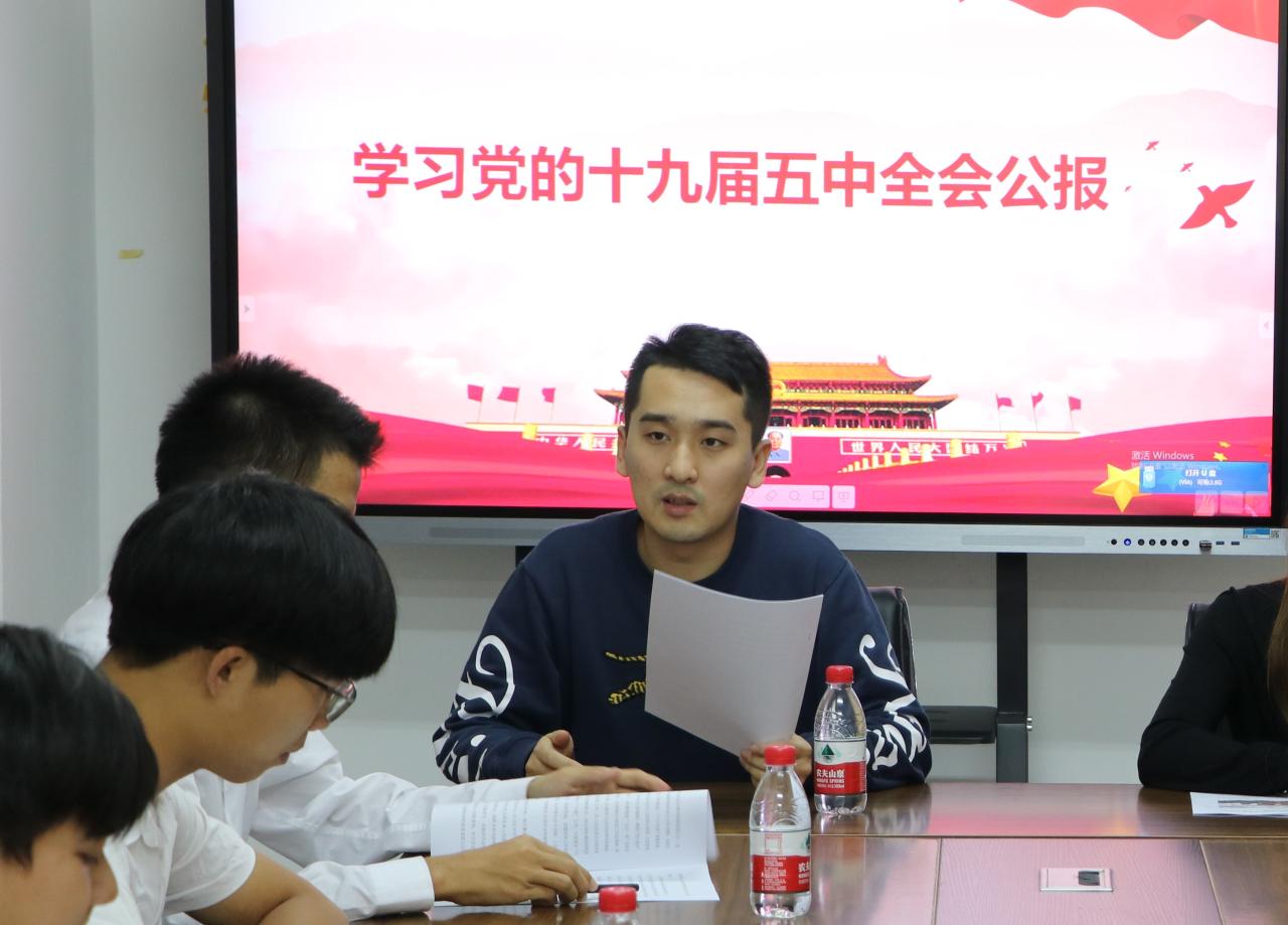 会议伊始,团委书记王曦带领员工组织成员阅读学习十九届五中全会公报。他指出,党的十九届五中全会是在我国将进入新发展阶段、实现中华民族伟大复兴正处在关键时期召开的一次具有全局性、历史性意义的重要会议。他强调,公司师生群体要精准落实全会精神,员工干部要起好带头作用,做好宣传学习工作,按照中央以及教育部有关文件精神,迅速在全院范围内,通过组织开展员工干部内部学习会议,全体员工团支部书记交流会议,以班级为单位的班级学习会议等全面系统地学习传达全会精神,同时在员工党员培训活动中安排专题学习,做到全面系统学、联系实际学,用心学进去、用情讲出来、用力做起来。