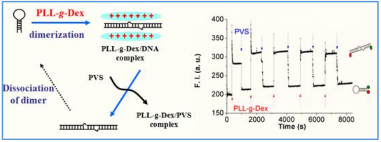 (1)利用 DNA 组装出纳米尺度下的分子机器,对我们认识 DNA 的构型转换规律、生物分子的相互作用与调控机制有着重要意义。DNA 分子机器运转的基础是 DNA 构型间的可控转换。我们合成出一种含有多糖支链的梳型阳离子共聚物 PLL-g-Dex,其可以促进 DNA 的链交换反应,并且提高 DNA 二级结构的稳定性。我们以 PLL-g-Dex 作为“燃料”驱动自补偿型 DNA 纳米机器实现快速、有效的运转。在此基础上,我们筛选出结合抗肿瘤活性功能蛋白的适配体作为目标DNA,通过适配体结构的转化实现功能蛋白的靶向释放,这就为 DNA 纳米机器在肿瘤检测与治疗方面的应用提供了可能。