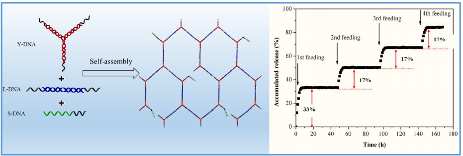 (2)核酸适配体功能化的 DNA 水凝胶可以作为蛋白质负载体系,利用其与核酸适配体互补的单链 DNA 实现功能蛋白的可控释放。我们构建了 DNA 结构单元,将其与单链 DNA 适配体通过自组装制备出核酸适配体功能化的 DNA 水凝胶。凝胶过程可在生理条件下快速完成,并且能够快速、稳定的捕获特定的蛋白质分子。在互补单链 DNA 的作用下,核酸适配体与其杂交形成双链,从而使蛋白质分子从适配体中快速分离,并呈现出智能化的可控释放功能。
